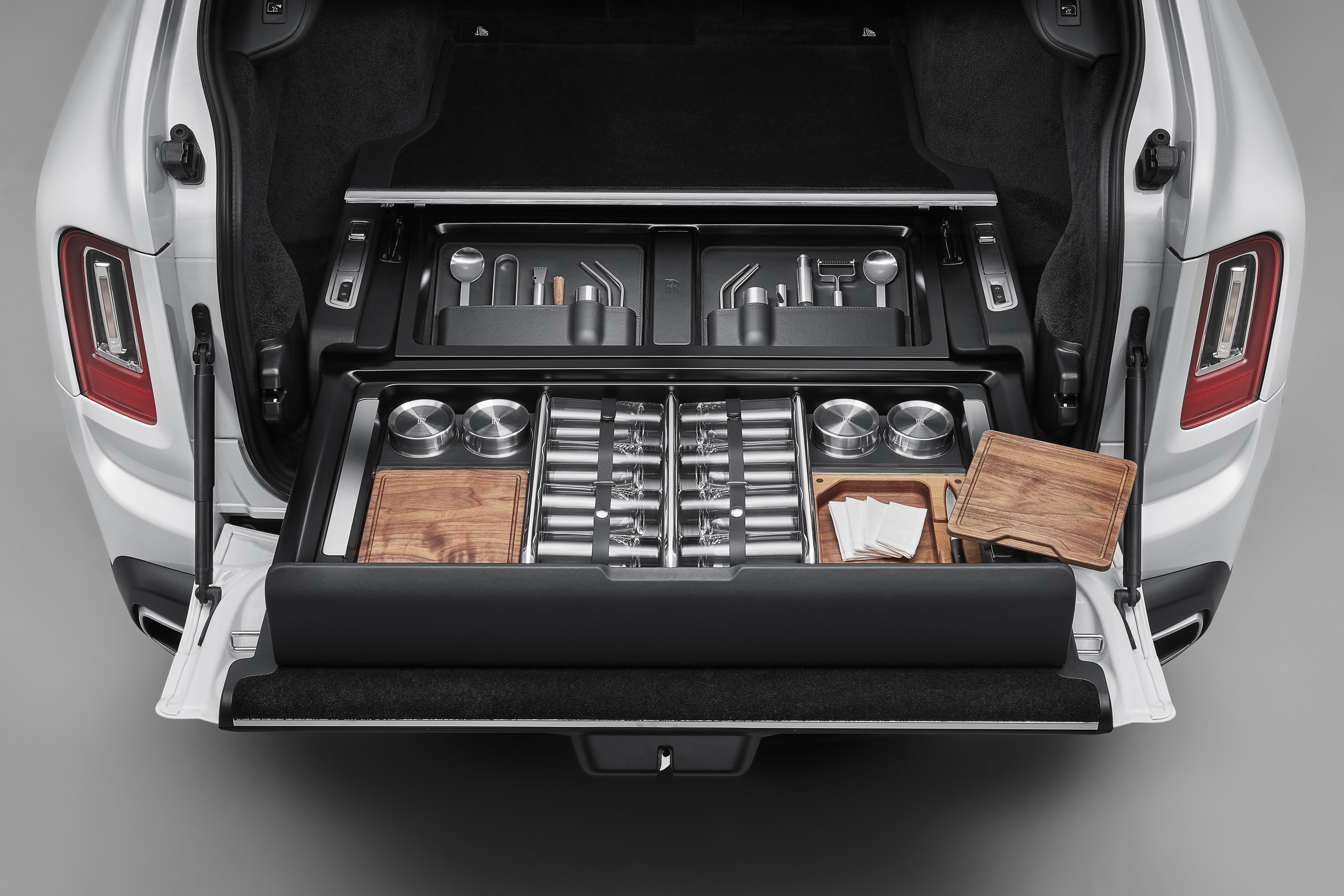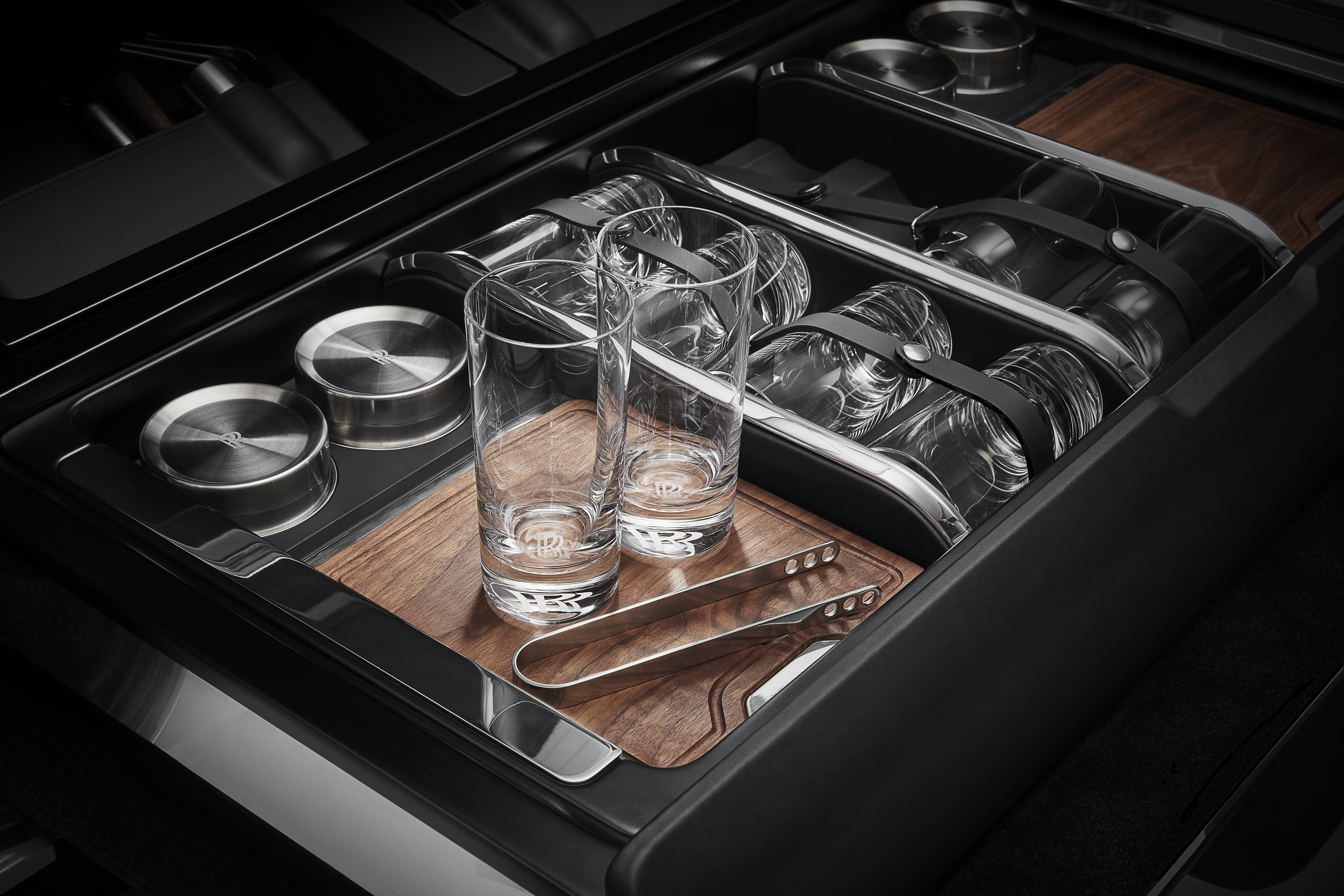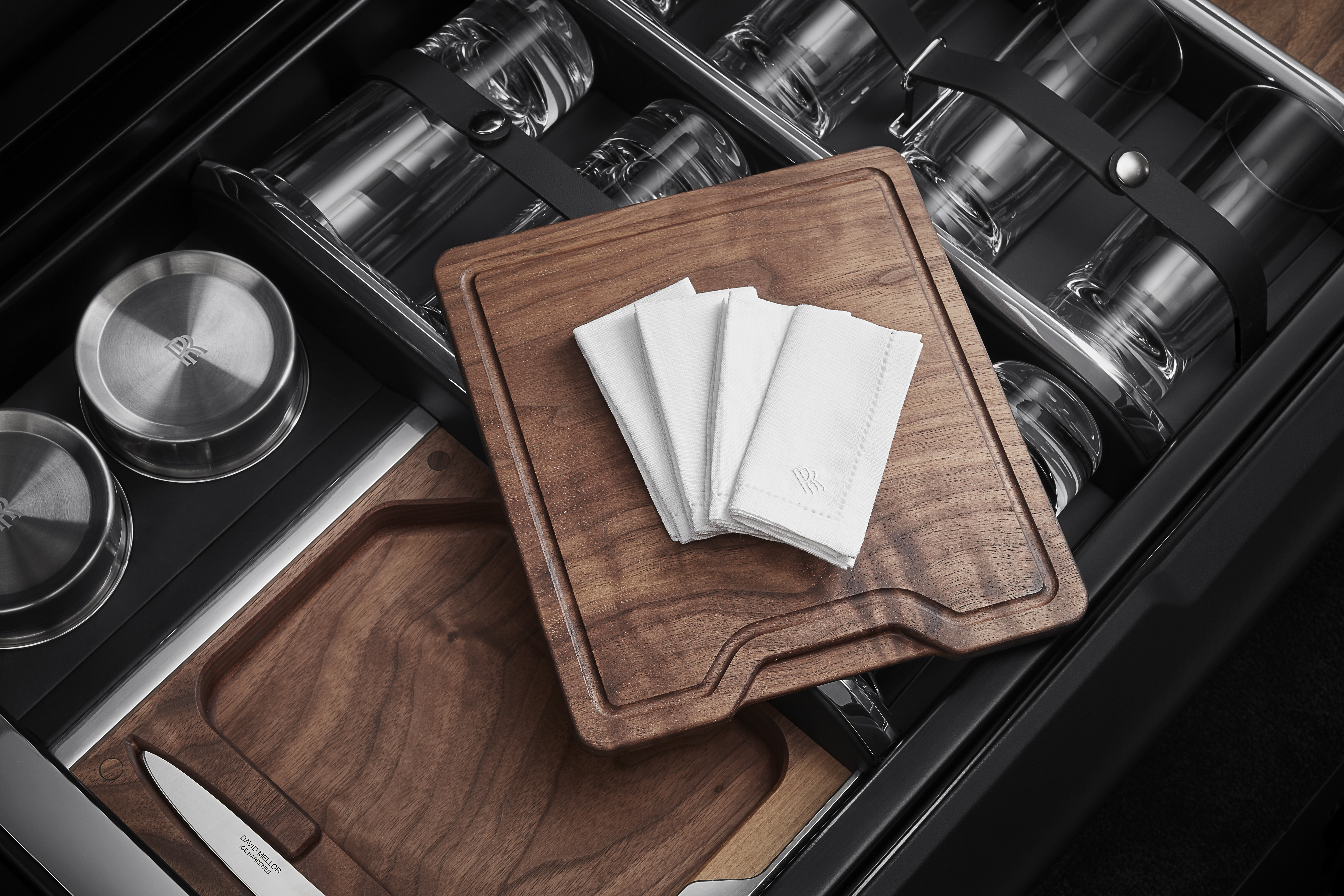 ROLLS-ROYCE MOTOR CARS CULLINAN RECREATION MODULE - ELEGANT HIGHBALL GLASSES ADORNED WITH DISCREET ROLLS-ROYCE MONOGRAMS AND WOODEN CHOPPING BOARDS MADE OF THE HIGHEST QUALITY AMERICAN WALNUT