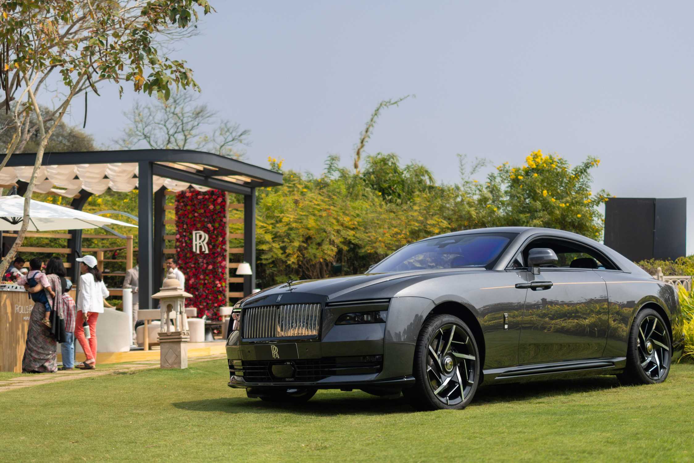 ARJUN OBEROI AND IRENE NIKKEIN, REGIONAL DIRECTOR FOR THE ASIA-PACIFIC REGION, ROLLS-ROYCE MOTOR CARS, ALONGSIDE BLACK BADGE SPECTRE AT OBEROI CONCOURS D'ELEGANCE